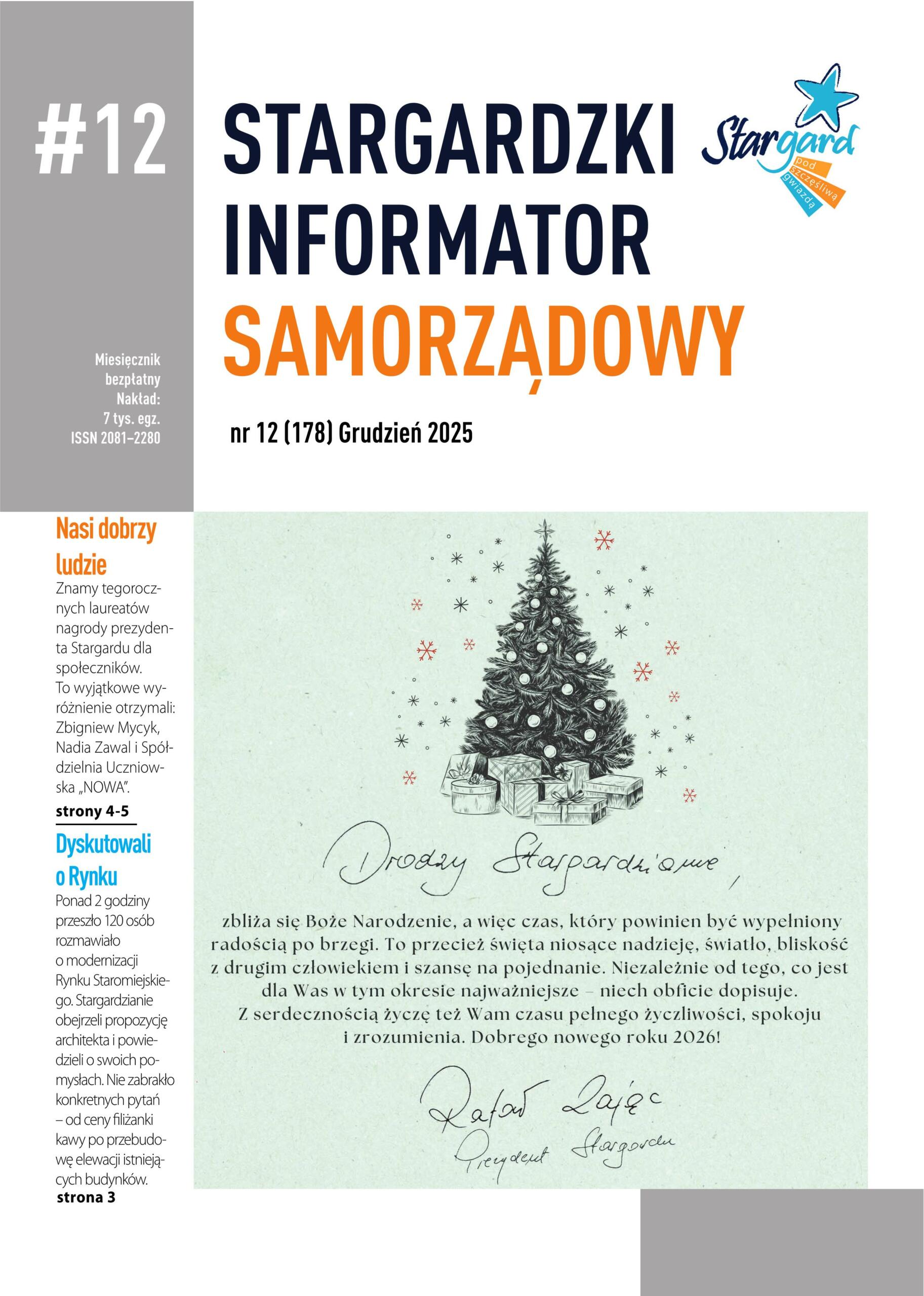 Już jest najnowszy i jednocześnie ostatni w tym roku numer Stargardzkiego Informatora Samorządowego. Można go pobrać z załącznika poniżej albo – w tradycyjnej, papierowej formie – zabrać do domu z jednego z ponad 40 punktów w całym mieście. Wszystkie adresy są tutaj. W grudniowym Informatorze są oczywiście życzenia dla mieszkańców od prezydenta Rafała Zająca, ale również wiele ciekawych wiadomości ze Stargardu. Można przeczytać o pomysłach na modernizację Rynku Staromiejskiego i poznać zdobywców tegorocznej nagrody dla społeczników. W SIS zapraszamy również do zobaczenia szopki w Urzędzie Miejskim i przejażdżki specjalnym, świątecznym autobusem MPK. Jest też temat szczególnie ważny zimą – pomoc osobom w kryzysie bezdomności. W naszym mieście tacy ludzie dostają kompleksowe wsparcie, jeśli tylko chcą z niego skorzystać.